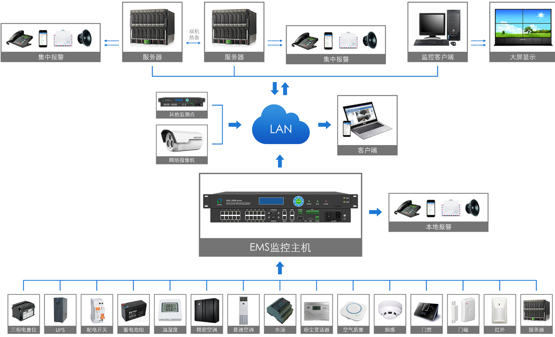 EMS系列監(jiān)控主機(jī)主要用以采集數(shù)據(jù)、處理數(shù)據(jù),可對(duì)環(huán)境、運(yùn)行負(fù)載、設(shè)備溫升、局放工況、安防、視頻、消防、智能設(shè) 備等進(jìn)行一體化監(jiān)控。在實(shí)際應(yīng)用中,與不同類型的傳感器相連,布線簡(jiǎn)潔,操作方便。